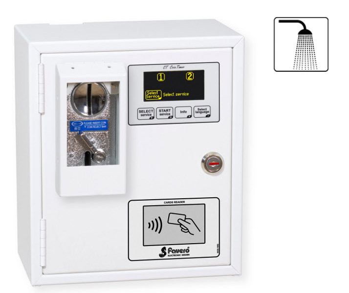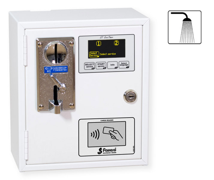 Zeitgeber für Münzen, Wertmarken und Wertkarten für 1-2 Duschen. Version mit elektronischem Münzautomat und Lesegerät von Wertkarten RFID contactless.