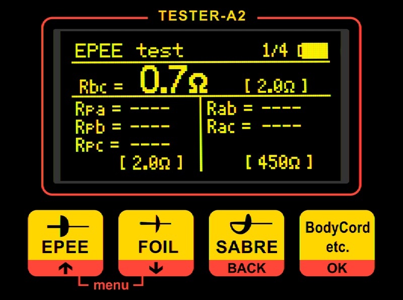 • Einfacher Gebrauch für schnelle Kontrollen: automatischer Vergleich der gemessenen Werte mit den Werten laut FIE-Reglement oder den vom Benutzer eingegebenen Werten. Das positive oder negative Prüfergebnis wird durch LED mit grünem oder rotem Licht und ein Tonsignal angezeigt.