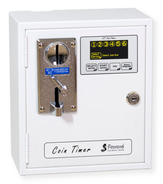 Coin, token and prepaid card operated Acceptors/Timers for 4-6 services.Version with electronic coin acceptor and RFID prepaid card contactless readers.