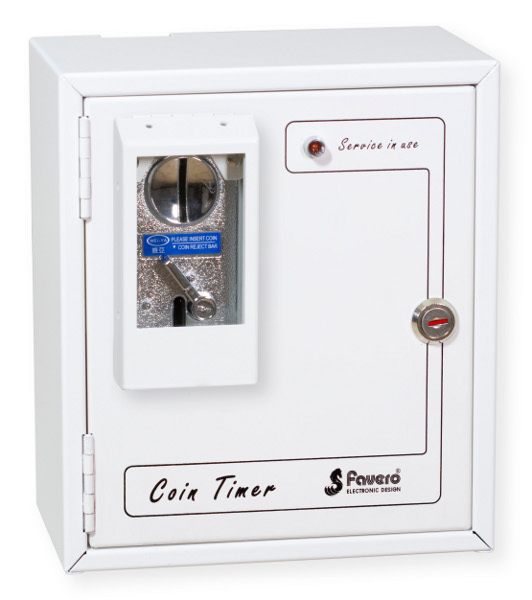 Zeitgeber für Münzen, Wertmarken und Wertkarten für 4-6 Services. Version mit elektronischem Münzautomat und Lesegerät von Wertkarten RFID contactless.