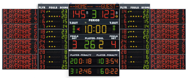 - Omologato F.I.B.A. (info, certificato FIBA). Può essere usato assieme ad altri modelli per comporre grandi tabelloni che visualizzano molteplici informazioni (info).